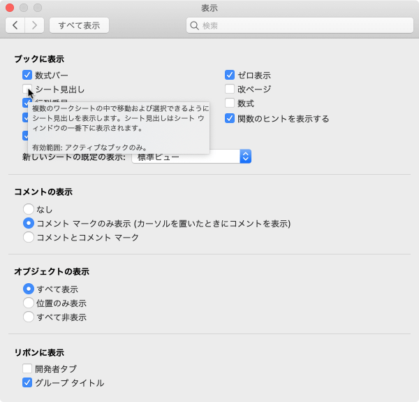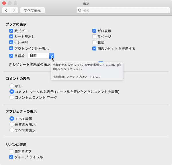 数式バー、ゼロ表示、シート見出し、改ページ、行列番号、数式、アウトライン記号、ステータスバー、セルの枠線を表示または非表示にするには、Excel 環境設定の[表示]にて設定します。