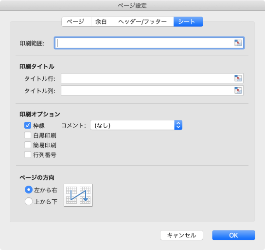 枠線をプリントする場合は、必ず[ページ設定]ダイアログボックスの[シート]タブで[印刷オプション]の[枠線]チェックボックスをオンにしてください。