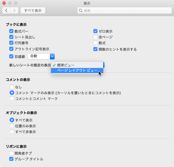 - [新しいシートの既定の表示]のプルダウンを[ページ レイアウト ビュー]にします。