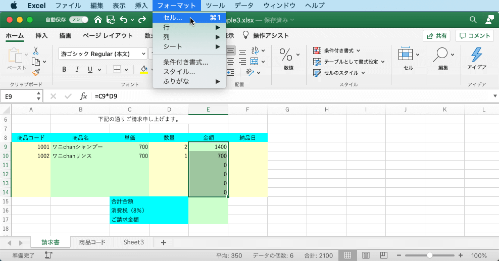 - 対象となるセル範囲を選択し、[フォーマット]メニューの[セル]を選択するか、⌘キーを押しながら1キーを押します。