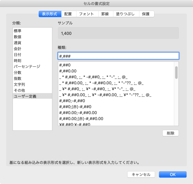 - [セルの書式設定]ダイアログボックスの[表示形式]タブを開き、分類一覧から[ユーザー定義]を開いて、[種類]ボックスに