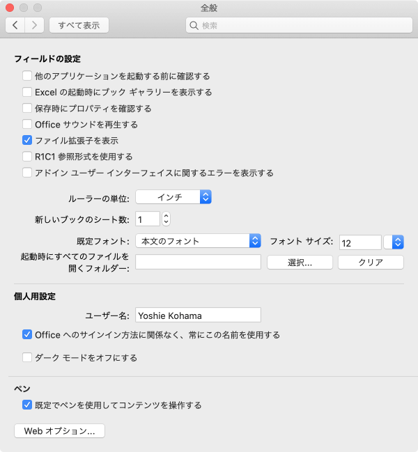 - Excelの環境設定の[全般]を選択します。