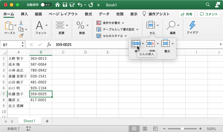- セルを右クリックしてショートカットメニューより[挿入]を選択