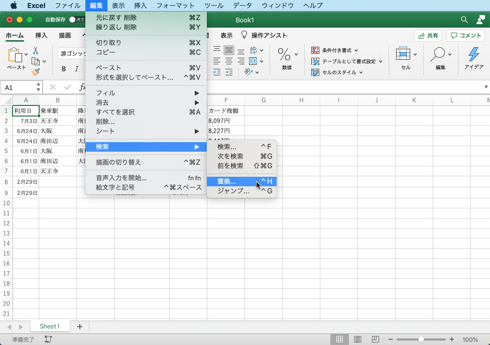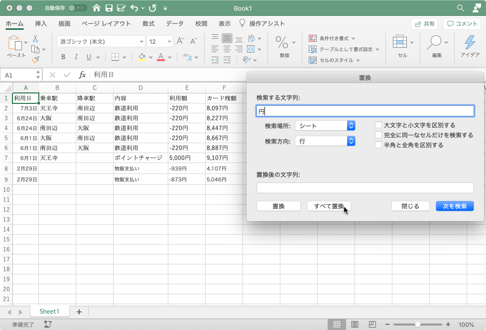 たとえば「1000円」のように数値に文字列が入った場合は文字列として認識されるので計算できません。そこで、置換機能を使用して「円」を取り除いてみましょう。Excel for Macでは[編集]メニューの[検索]をポイントし[置換]を選択するか、[ホーム]タブの[編集]グループの[検索と選択]から[置換]を選択して[置換]ウィンドウを表示し、[検索する文字列]には「円」と入力して、[置換後の文字列]には何も入力しないで[置換]ボタンをクリックするとOKです。[すべて置換]ボタンをクリックするとすべて置換されます。置換のショートカットキーはWindowsと同様、control+Hです。