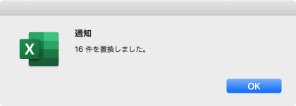 - 置換結果のメッセージが表示されたら[OK]ボタンをクリックします。