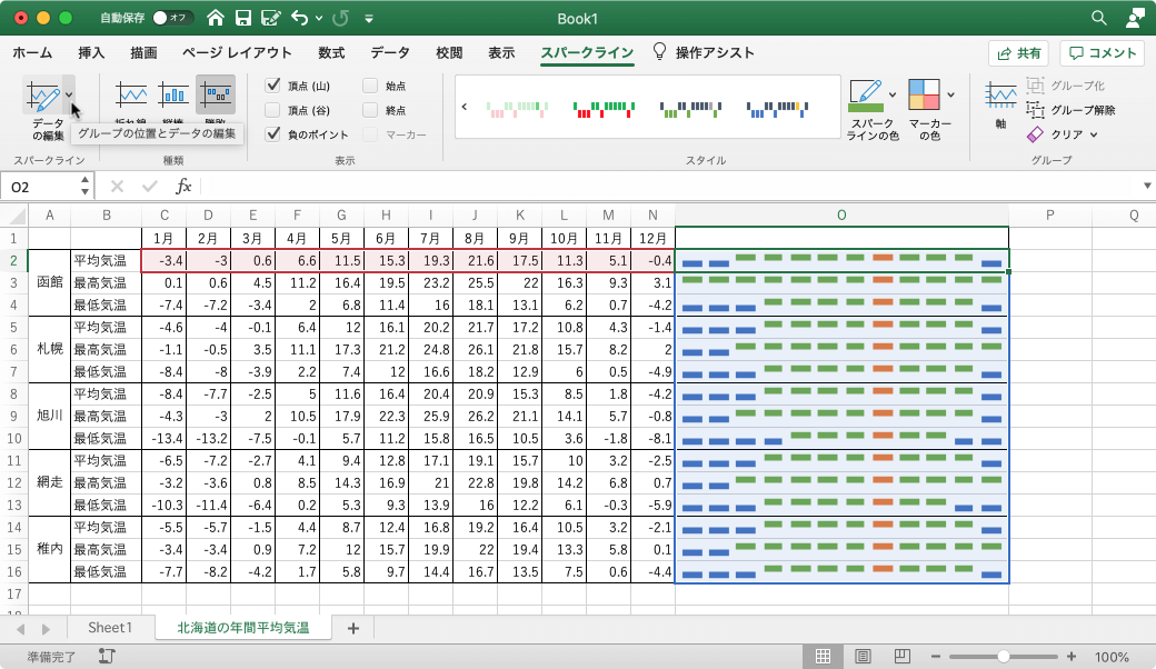 [スパークライン]タブの[データの編集]ボタンをクリックすると、グループの位置とデータの編集画面になりますが、スパークラインデータに必要なデータが含まれているブック内の範囲を選択したり、スパークラインを1つだけ変更する場合は、単一スパークラインのデータの編集オプションを使用します。