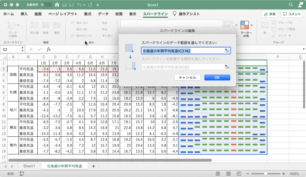 スパークラインのデータの表示方法を変更するには