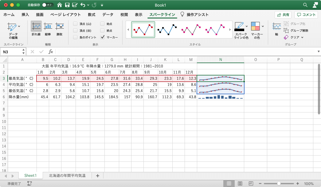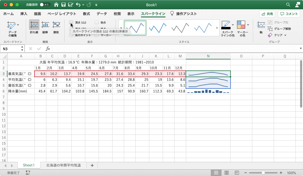 - 各行スパークラインにある各点が強調表示されました。