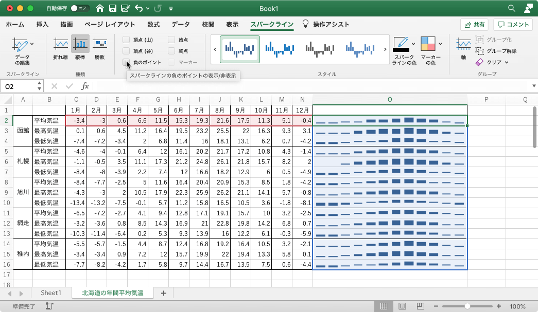 - スパークラインの負のポイントの表示/非表示