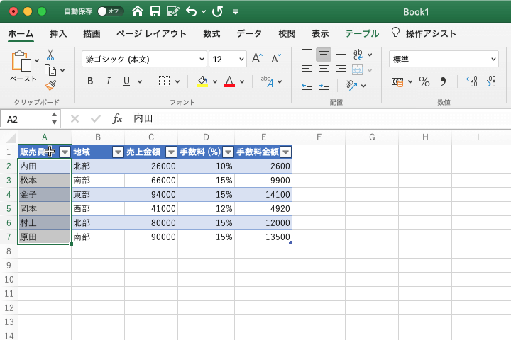 テーブル内でも、ワークシート上と同様に単独セルやセル範囲を選択できますが、テーブルの行や列の選択方法は、ワークシートの行や列を選択する場合とは異なります。行や列のデータを選択する際、行番号や列番号に触れないように注意してください。