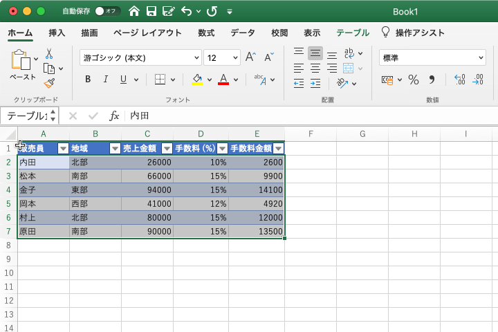 - この表示のときにマウスをクリックすると、テーブル全体のテーブル データが選択されます。