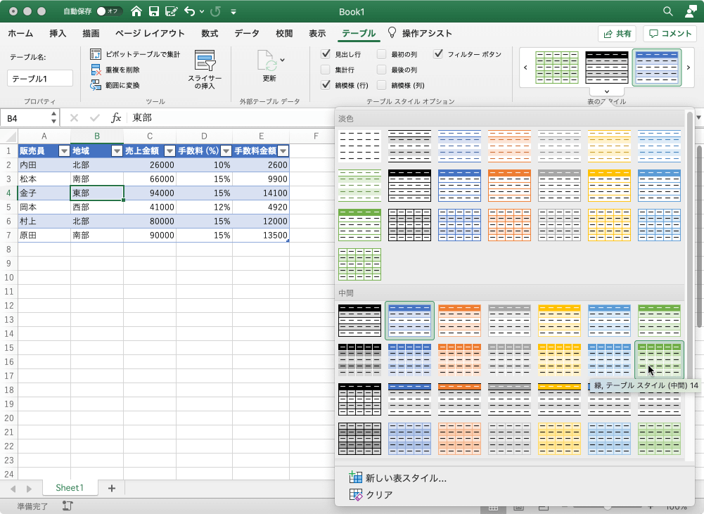 Excelには多数の定義済みのテーブル スタイル(クイック スタイル)が用意され、これを使用するとテーブルの書式をすばやく設定できます。テーブル内にカーソルを移動し、[テーブル]タブを開き[表のスタイル]グループの[クイックスタイル]一覧から選択します。