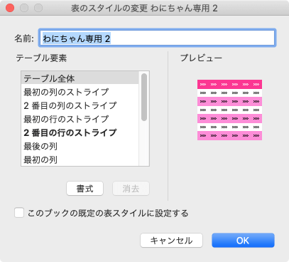 - テーブル スタイルを現在のブックの既定のテーブル スタイルとして使用するには、[このブックの既定の表スタイルに設定する]チェック ボックスをオンにします。