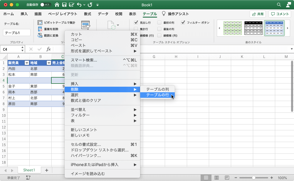 - 右クリックしてショートカットメニューより[削除]をポイントし、[テーブルの行]を選択します。