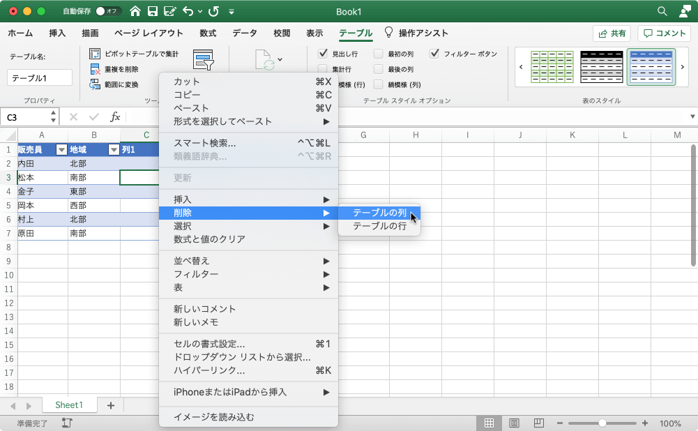 - 対象となるセルを右クリックしてショートカットメニューより[削除]をポイントし、[テーブルの列]を選択します。