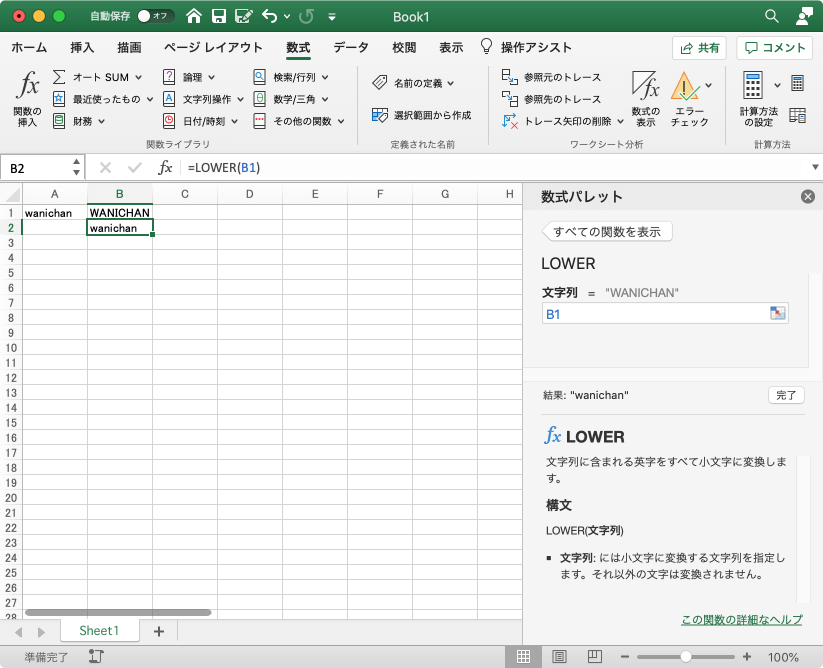 <文字列>内の大文字を、すべて小文字に変換します。<文字列>には小文字に変換する文字列を指定します。文字列には、目的の文字列が入力されたセル参照を指定することもできます。