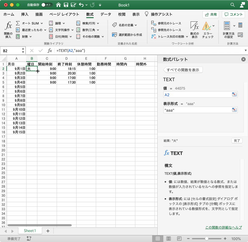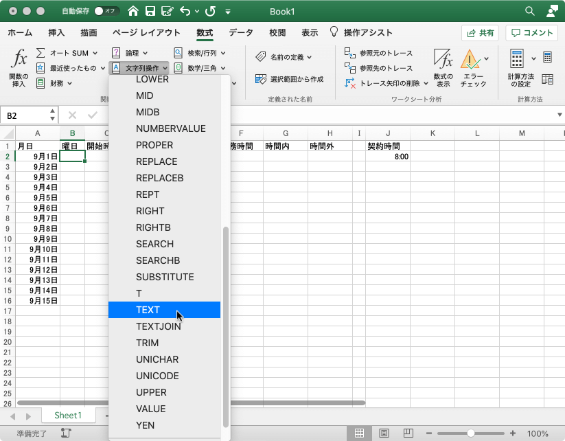日付が入ったセルの隣にそれに対応する曜日を求めるには、TEXT関数を利用します。[数式]タブを開き、[関数ライブラリ]の中から[文字列操作]をクリックし、[TEXT]を選択します。表示形式には”(ダブルクォーテーション)で括ります。曜日の表示形式は4パターンあります。
