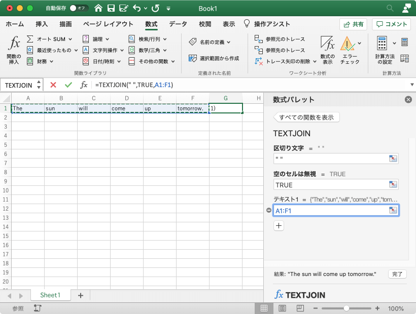 TRUEと入力します。 - [テキスト1]ボックスには、結合する配列のセル範囲を選択して[完了]ボタンをクリックします。