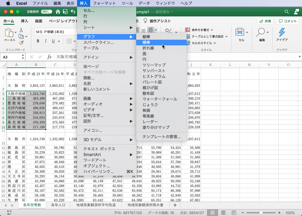 - 項目軸とデータ範囲を指定して[挿入]メニューの[グラフ]をポイントして[横棒]を選択します。