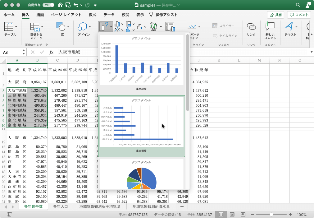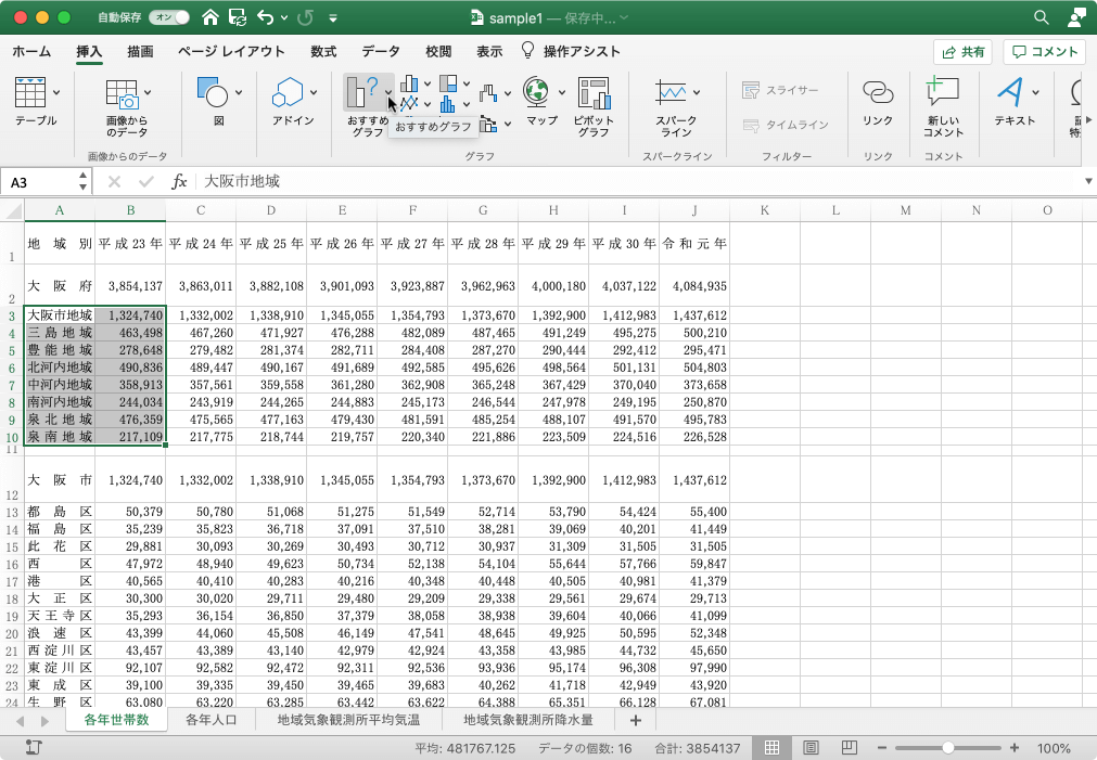 - 項目軸とデータ範囲を指定して[挿入]タブの[グラフ]グループの[おすすめグラフ]をクリックします。