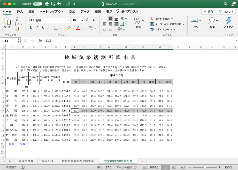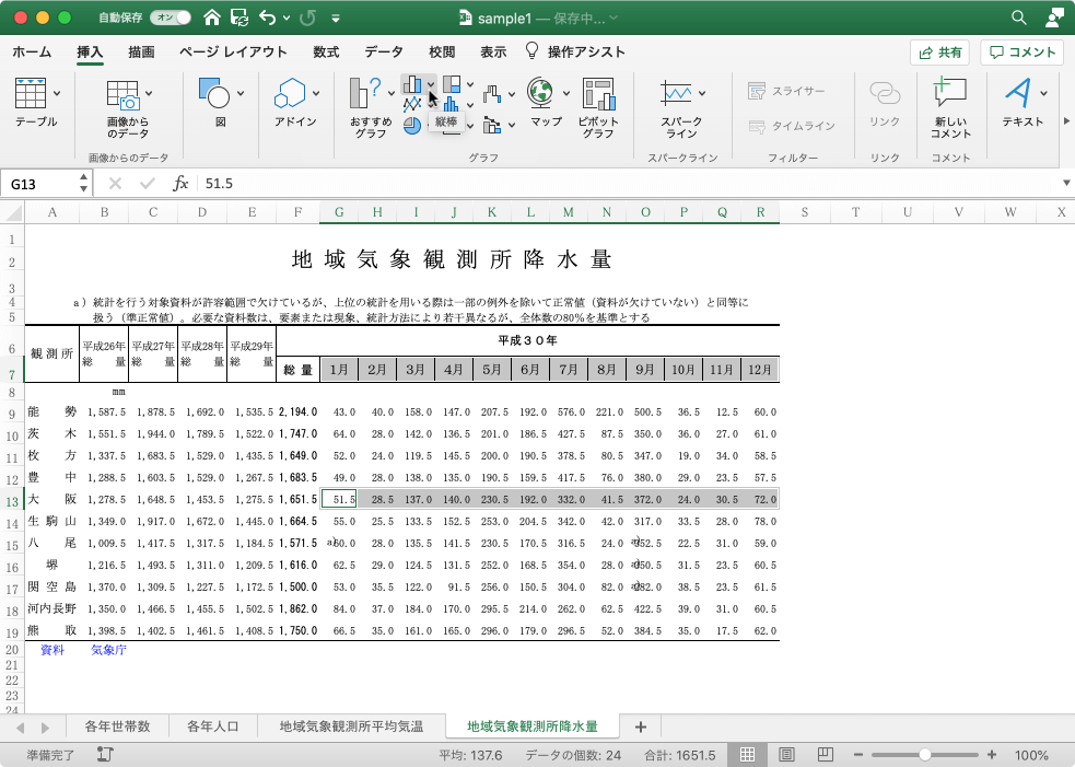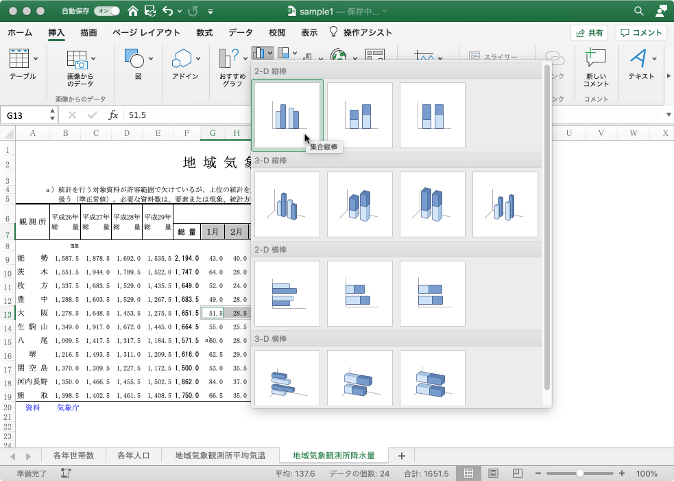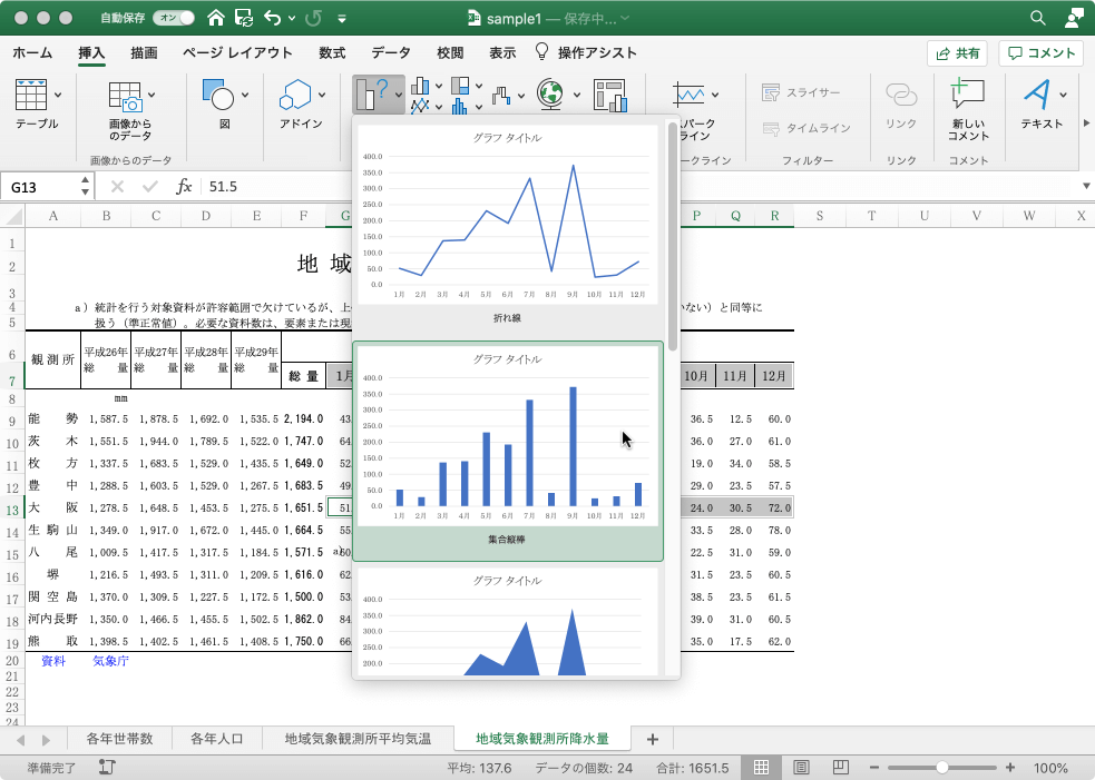 月別降水量を表すグラフを作成するには