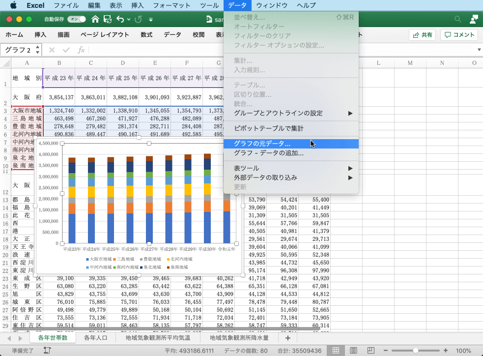 - グラフを選択して[データ]メニューの[グラフの元データ]を選択します。
