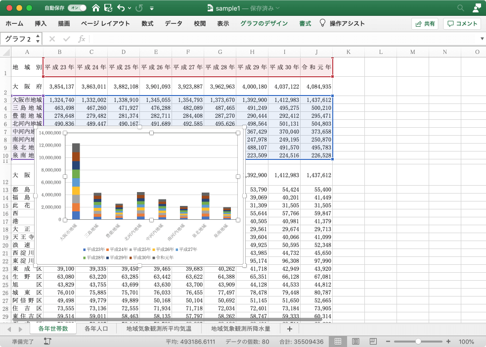 - グラフを選択して[グラフのデザイン]タブを開きます。