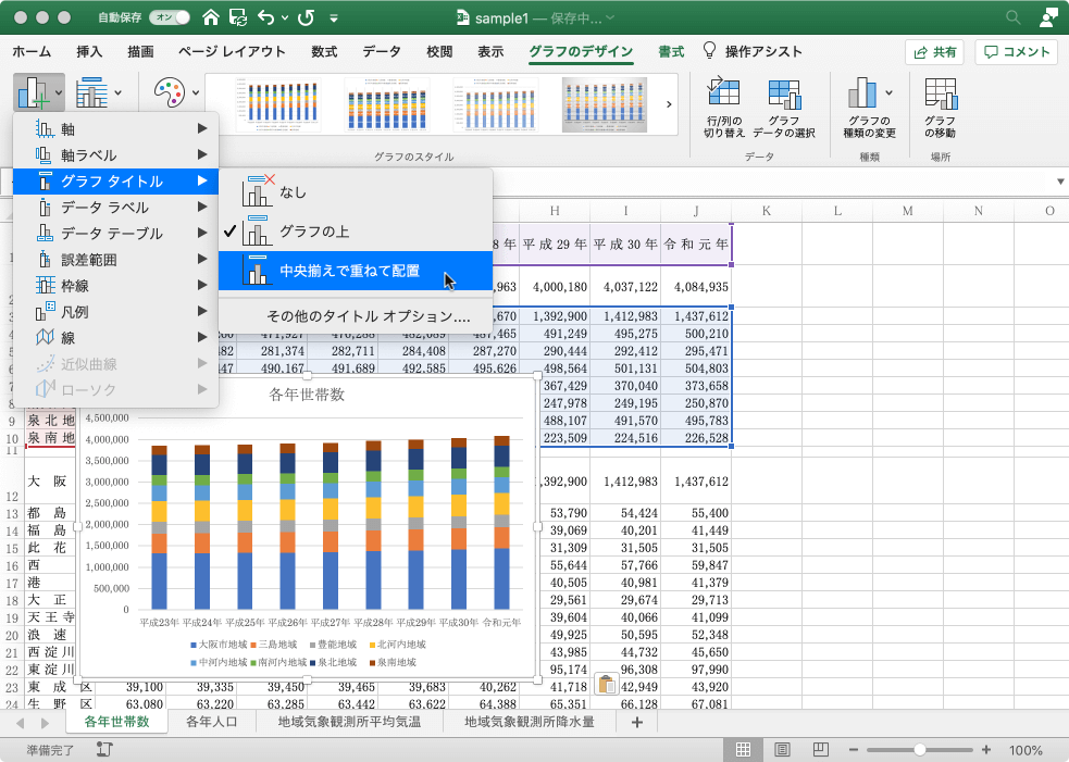 - [グラフタイトル]をポイントして、配置方法を選択します。ここでは[中央揃えで重ねて配置]を選択します。