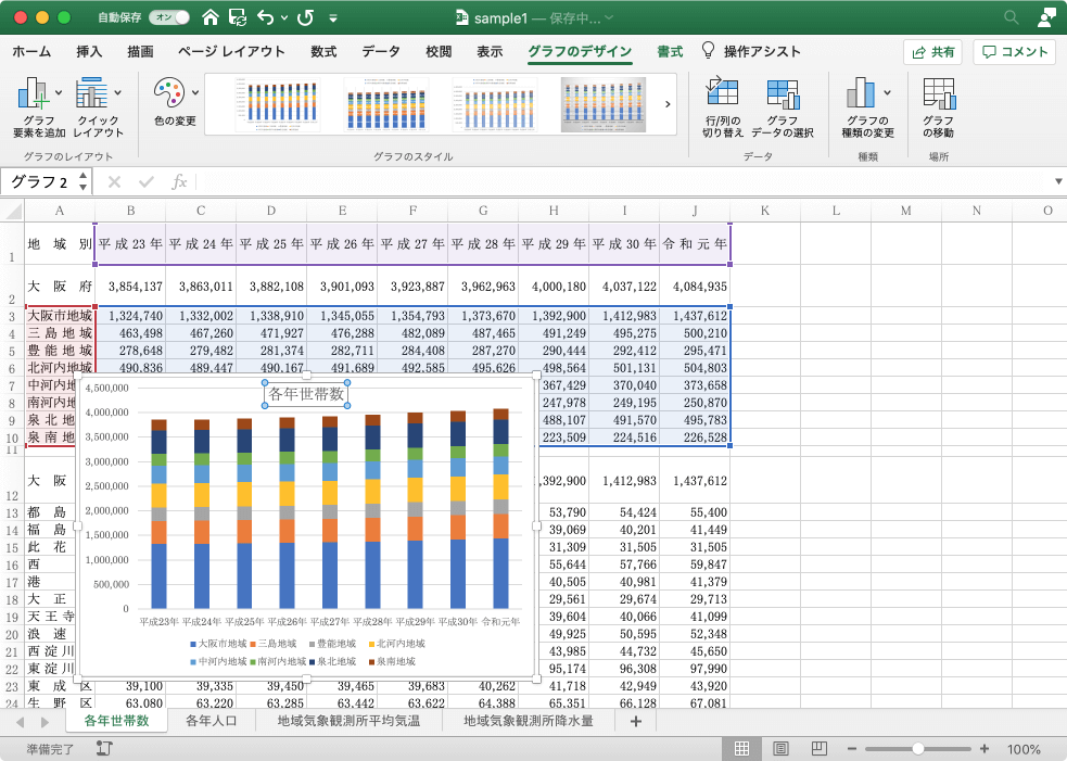 - グラフを選択し、[グラフのデザイン]タブの[グラフ要素を追加]ボタンをクリックします。
