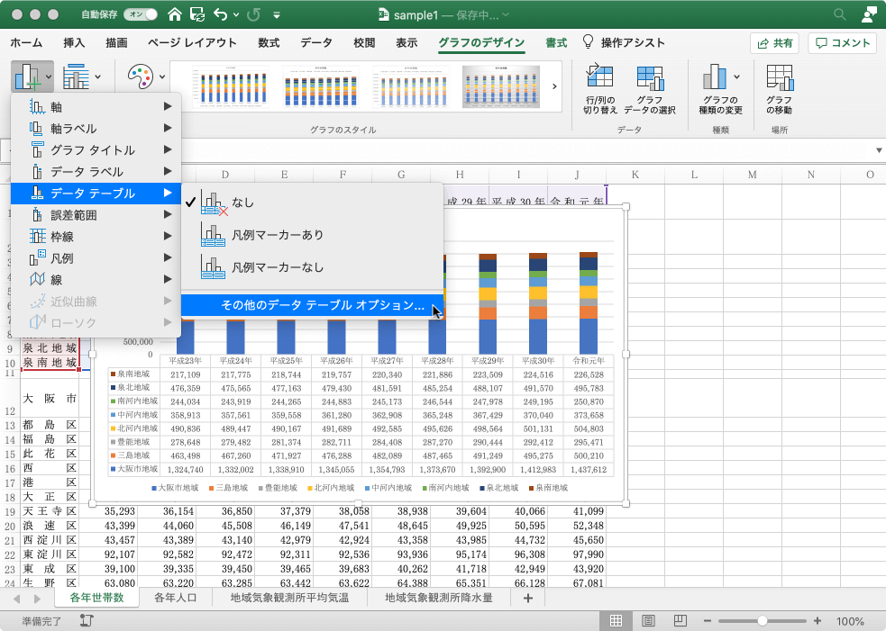 [グラフのデザイン]タブの[グラフ要素を追加]ボタンより[データテーブル]をポイントして、[その他のデータテーブルオプション]を選択します。
