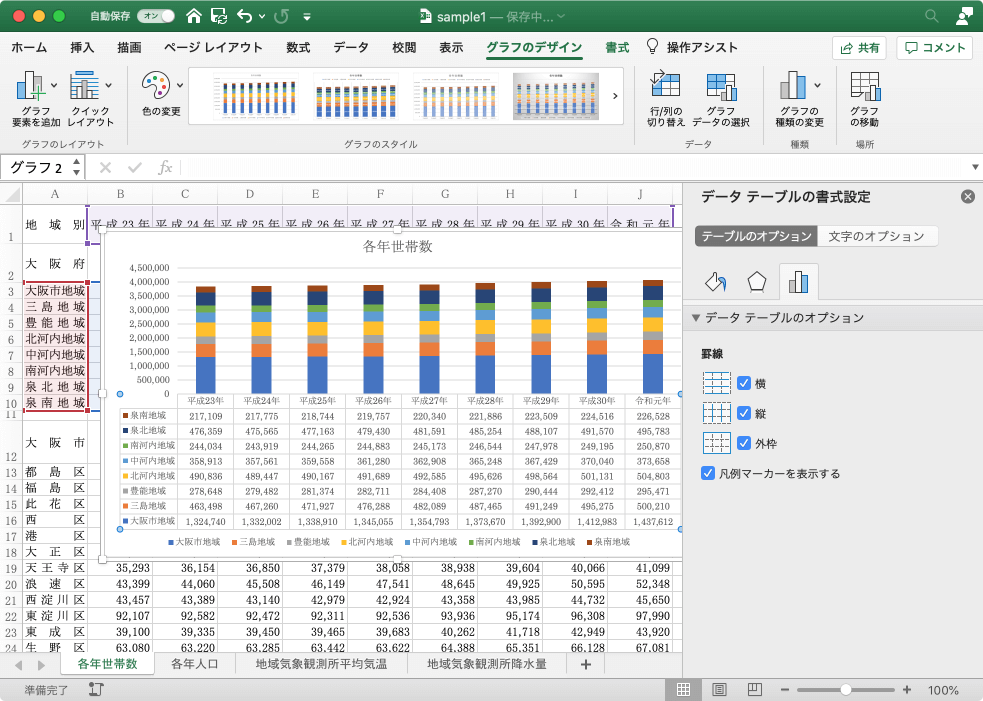 データラベルでは乱雑になってしまうグラフの場合は、データテーブルを追加するとよいでしょう。グラフを選択し、[グラフのデザイン]タブの[グラフ要素を追加]ボタンより[データテーブル]をポイントして、配置方法を選択します。データテーブルの書式設定のテーブルオプションでは、罫線の適用方法を選択できます。