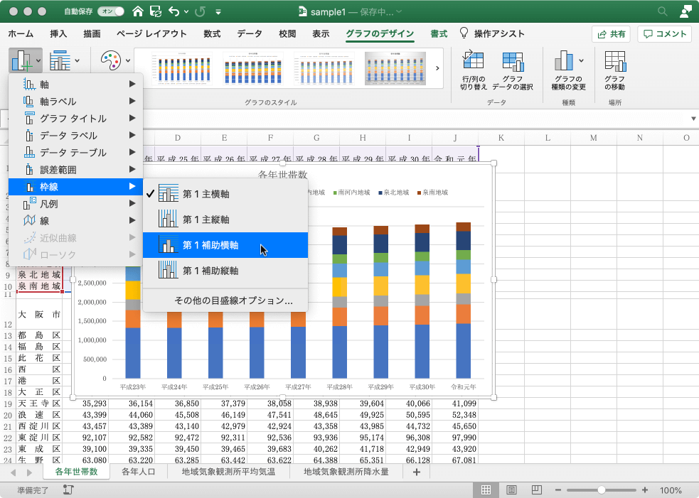 - [枠線]をポイントして、[第一補助縦軸]または[第一補助横軸]を選択します。