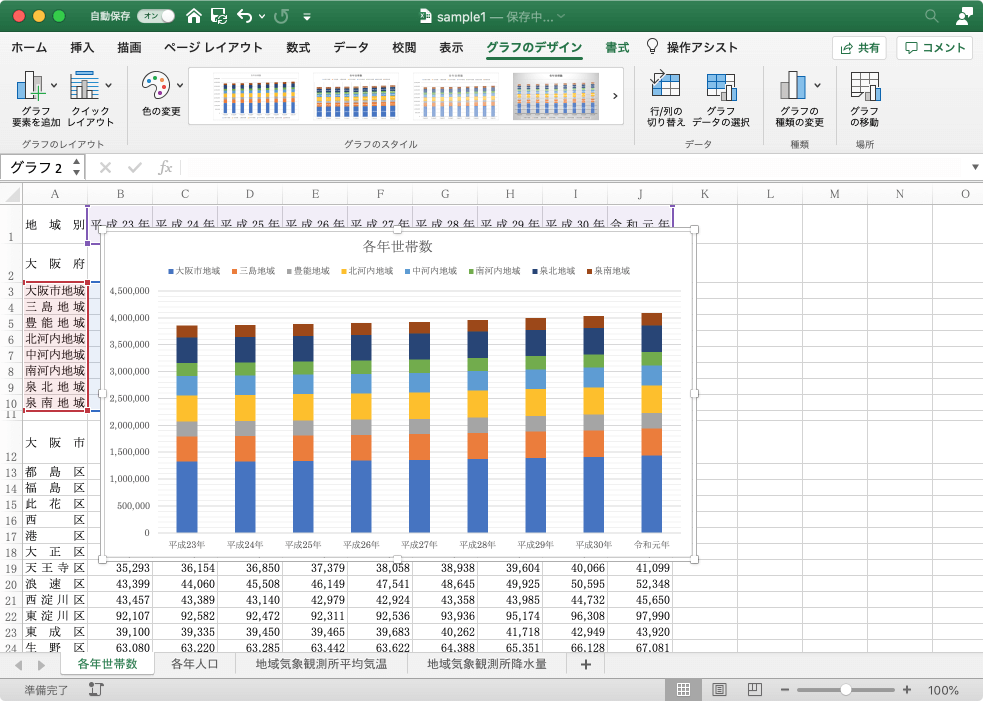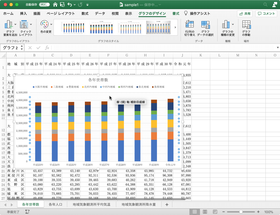 - グラフを選択し、[グラフのデザイン]タブの[グラフ要素を追加]ボタンをクリックします。