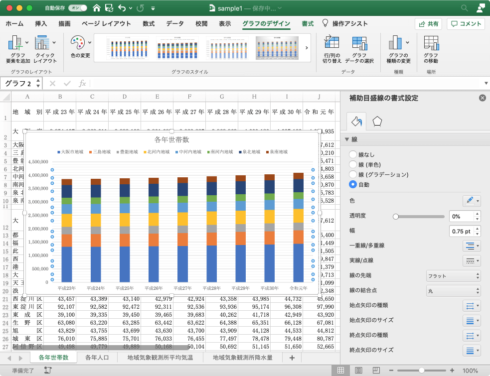 補助目盛線の書式を変更するには、グラフ内の補助目盛線をダブルクリックします。