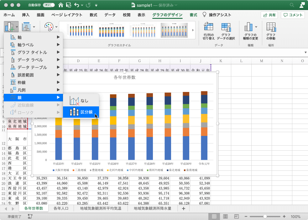 積み上げ棒グラフで区分線を付けて推移の割合をわかりやすくするには、グラフを選択し、[グラフのデザイン]タブの[グラフ要素を追加]ボタンより[線]をポイントして、[区分線]を選択します。