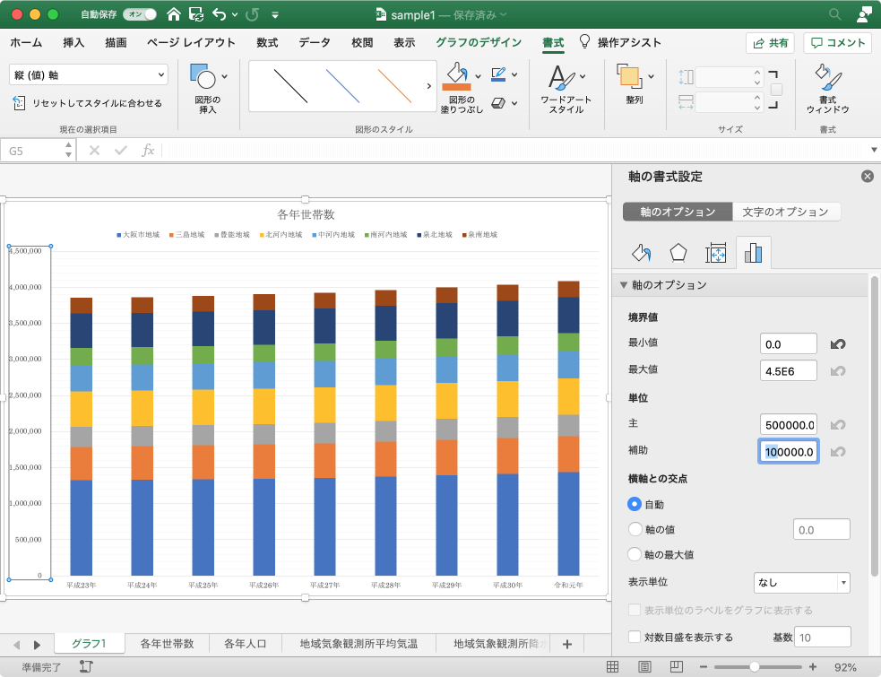 主軸を右クリックしてショートカットメニューより[軸の書式設定]をクリックするか、主軸をクリックして[書式]タブを開き、[書式ウィンドウ]をクリックします。
