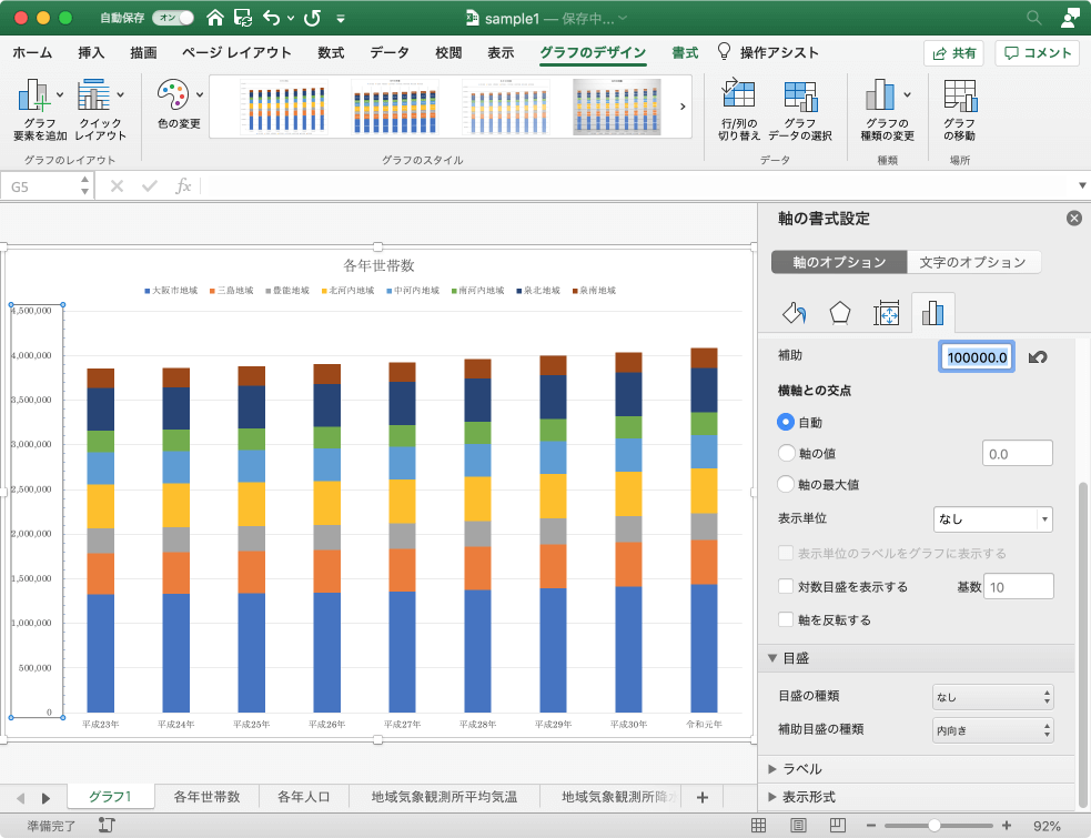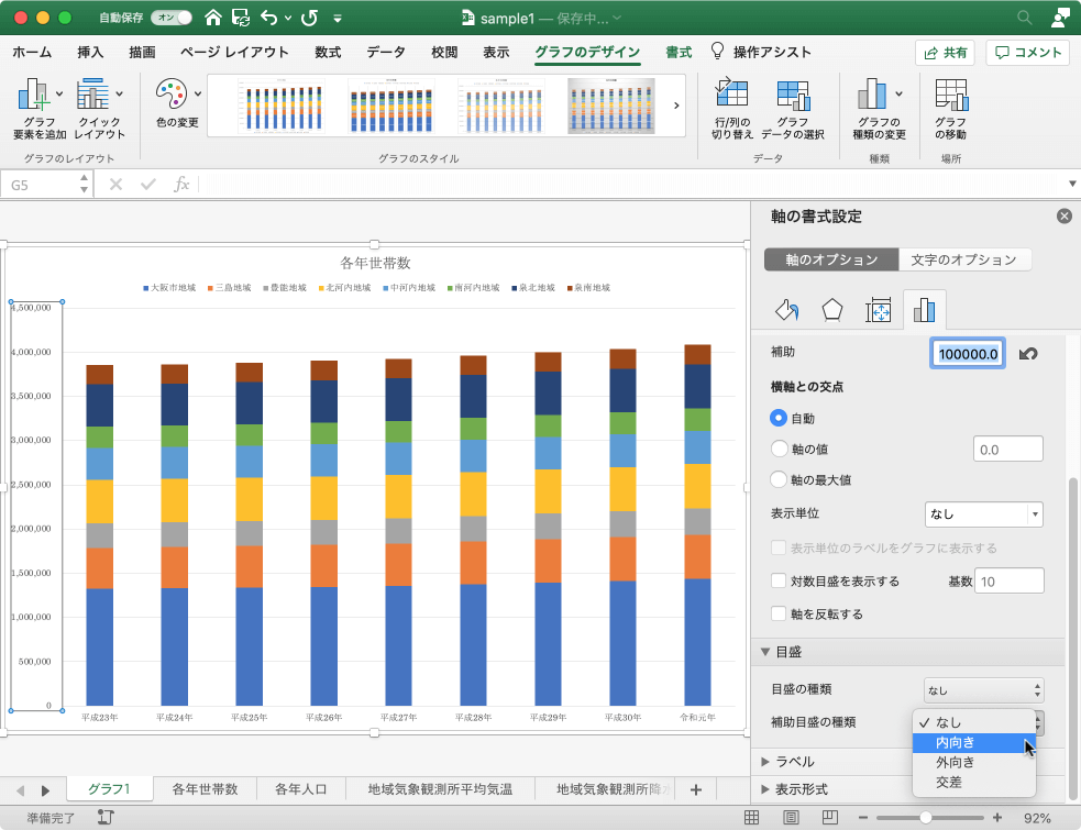 グラフの主・補助軸の目盛の間隔や種類を設定するには