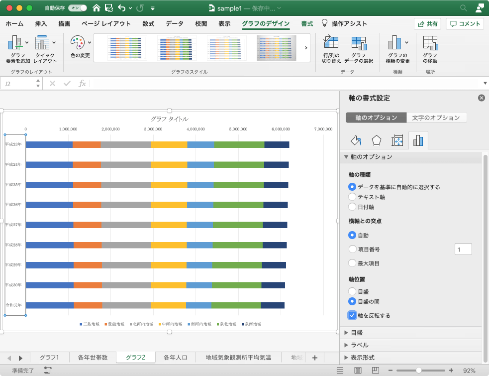 - [軸の書式設定]作業ウィンドウの[軸のオプション]タブが開いたら[軸を反転にする]にチェックを付けます。