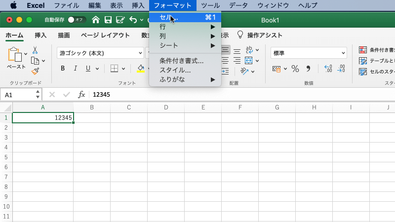 漢数字で数値を表示したいセルを選択し、[フォーマット]メニューの[セル]またはcommandキーを押しながら1キーを押します。