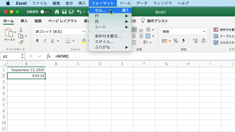 時刻が入ったセルを選択し、[フォーマット]メニューの[セル]またはcommandキーを押しながら1キーを押します。