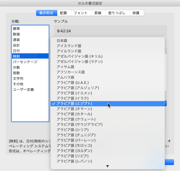 - [セルの書式設定]ダイアログボックスの[表示形式]タブで、[時刻]を選択します。