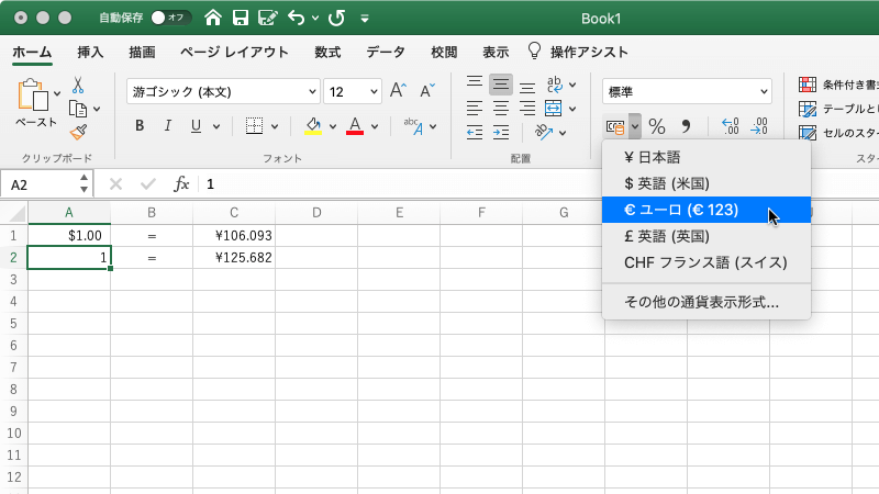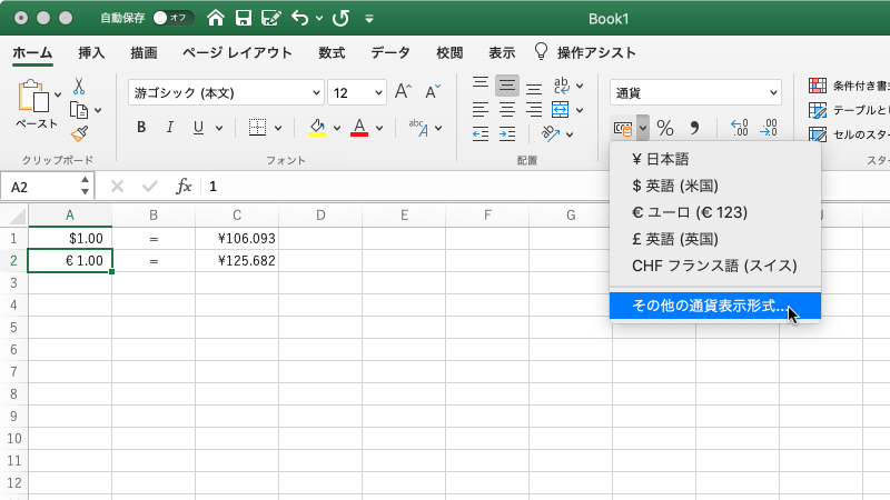 既定では日本円の通貨になりますが、そのほかの通貨の表示形式にするには、[ホーム]タブの[数値]グループの[通貨]ボタンの▼をクリックして、一覧から選択します。[その他の通貨表示形式]を選択すると、セルの書式設定ダイアログボックスが表示され、その他の国や地域の通貨の表示形式を設定できます。