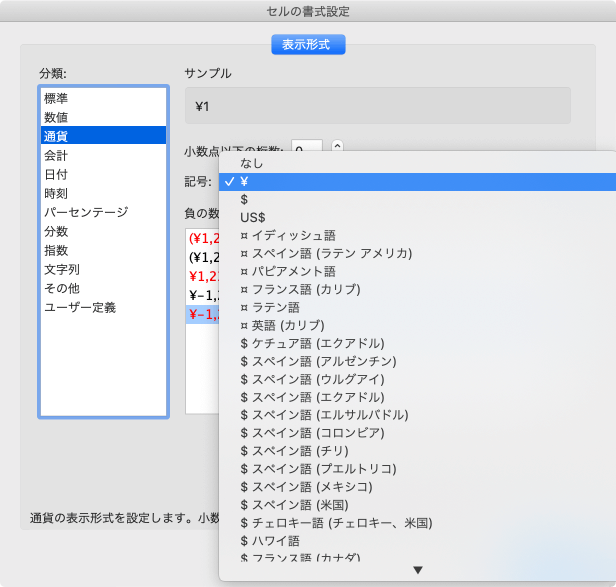 - セルの書式設定ダイアログボックスが表示されたら、[記号]プルダウンより通貨を選択するとOKです。