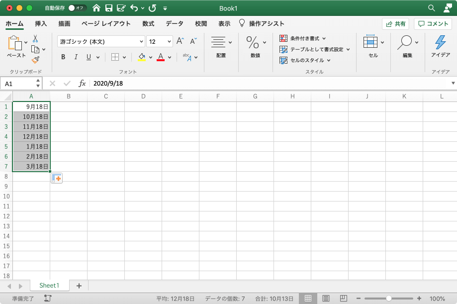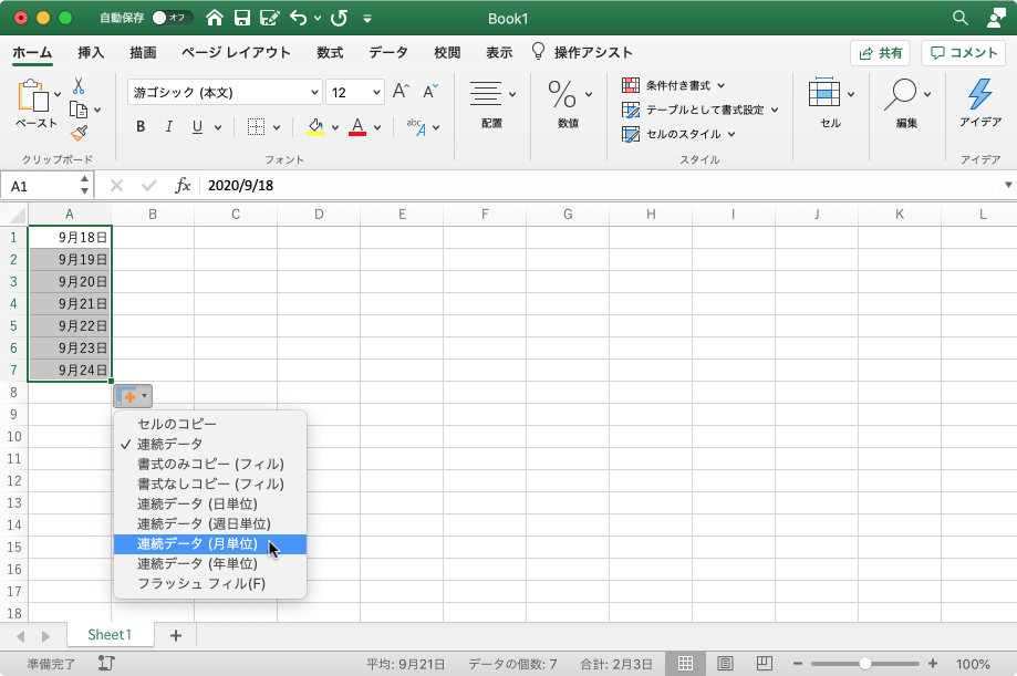 - フィルオプションボタンをクリックし、一覧から[連続データ (月単位)]を選択します。