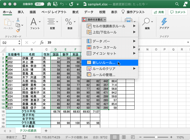 条件付き書式を適用したいセル範囲を選択し、[ホーム]タブの[条件付き書式]一覧から[新しいルール]をクリックします。