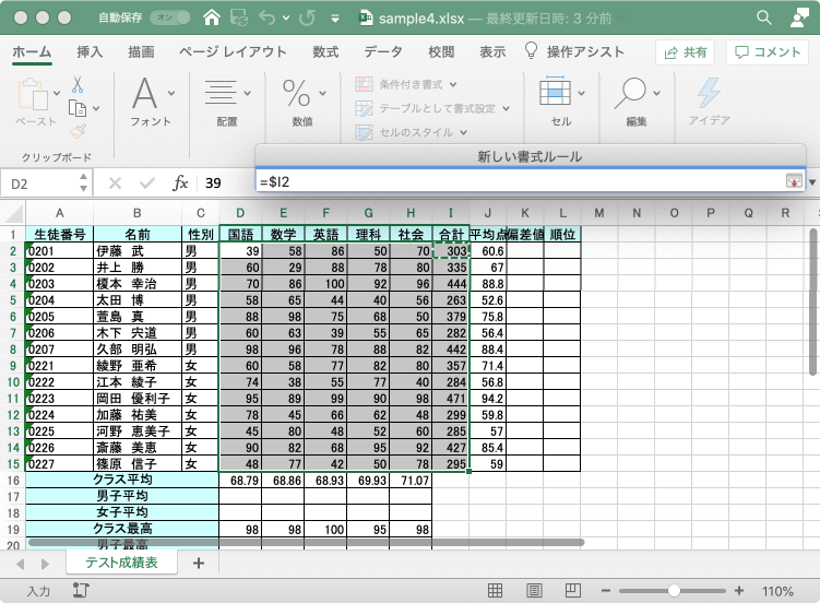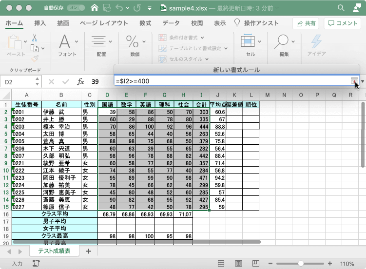 ルールを設定するセルと書式を設定するセルが異なる場合や、書式を行全体に設定する場合は、数式を使用して条件付き書式を設定します。ルールを設定するセル範囲に応じて、数式には相対参照、絶対参照、複合参照を設定します。ここでは、合計値が400以上の場合、それぞれのデータの行全体を太字にする方法について説明します。