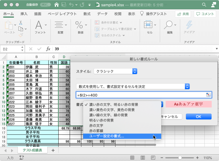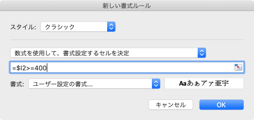 [次の数式を満たす場合に値を書式設定]ボックスに、「最初の合計セルが400以上の場合」という数式を入力します。行は固定してはいけないので、列固定の複合参照(F4キー2回押下)にします。