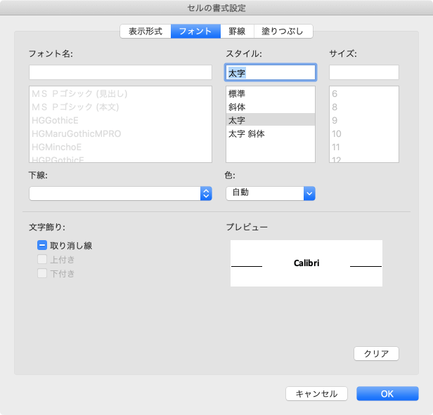 - [セルの書式設定]ダイアログボックスの[フォント]タブを開き、太字に設定します。