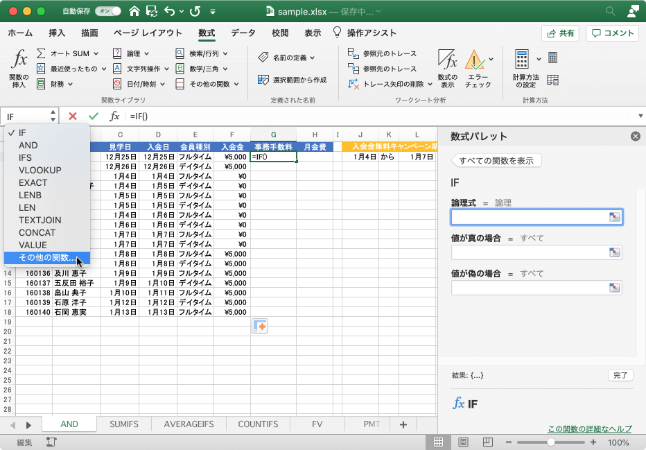 - IF関数の[論理式]にカーソルを移動して、名前ボックスから[その他の関数]を選択します。