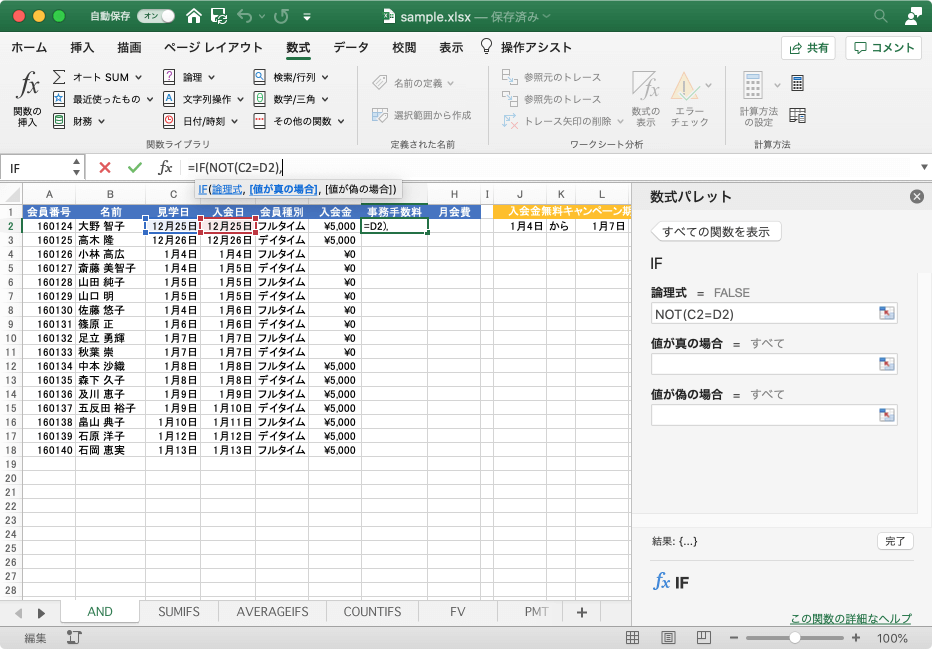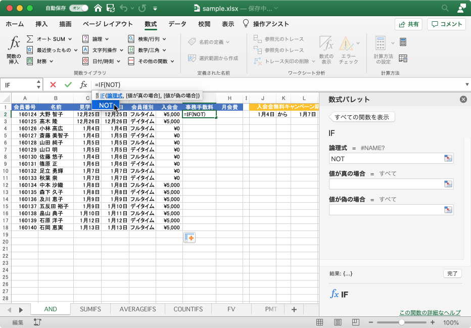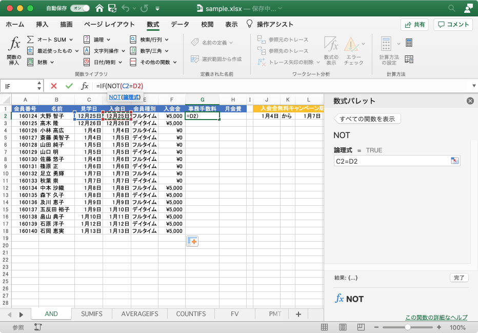IF関数にNOT関数を組み合わせると、「~以外の場合」といった条件式を作成できます。ただし、Excel for Macの数式パレットはWindows版の関数の引数ダイアログボックスと異なるため、ネストした論理式の操作ではWindows版と異なる方法で行う必要があります。